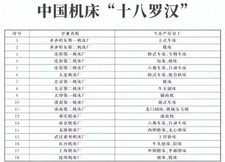 "十八罗汉":新中国成立初期确定的18家机床骨干国企,包括沈阳机床、大连机床、济南一/二机床、北京一机床等,曾撑起中国工业脊梁